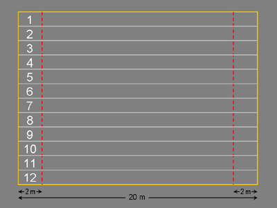 - 聽到「嗶」聲響,開始跑步,受測者必需在下次「嗶」聲響之前跑到 20 公尺外另一側的黃線,且至少必需有一隻腳踏到或越過黃線。之後向後轉。