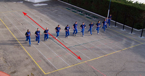 和許多現代陸軍一樣,外籍兵團在 2005 年起也改採用漸進式跑步 (Luc Leger, 英文稱為 Multi-Stage Fitness Test, 又稱 Beep Test) 來測驗報名者的心肺功能。 此測驗和傳統的 Test Cooper (12 分鐘跑步) 一樣,都是測試你的最大氧氣攝取量 (VO2 max)。 場地 測驗的場地就在甄選中心的集合場,平地,柏油路面。是一個長 20 公尺,共有 12 條跑道的測驗場地。如下圖所示,此圖的顏色及比例和測試場地一模一樣。
